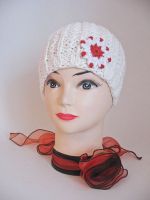 Caciulita tricotata din fir gros de PNA alb si floricica crosetata si aplicata